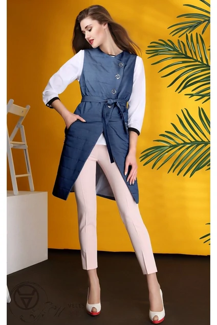 Жилет полуприлегающего силуэта со смещенной застежкой на кнопки. Перед с нагрудными вытачками и карманами. Вход в карманы обработан декоративными молниями. Жилет с поясом, стеганный. Утеплен тонким слоем синтепона. Длина по спинке 94см