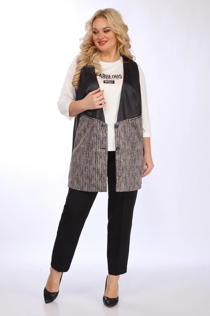 Жилетка изготовлена путем комбинирования двух видов ткани – трикотажного полотна и эко-кожи. Вырез горловины V-образной формы. Перед с подрезными боковыми деталями, в которых расположены карманы и отделочный элемент с молнией. Застежка центральная на две петли и пуговицы. Спинка на кокетке. По боковым швам обработаны разрезы. Жилет на подкладке. Длина жилета по спинке – 82 см.