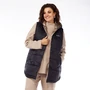 Жилет женский изготовлен из стеганой курточной ткани на синтепоне. Горловина оформлена капюшоном, с кулисой и втянутым шнуром с фиксатором. По переду обработаны карманы с листочками. Спинка цельнокроеная. Застежка на кнопки. Низ в изделии фигурный.В боковых швах по низу обработаны шлицы с кнопками. Декором служит нашивка на левой полочке. Температурный режим до -5.