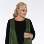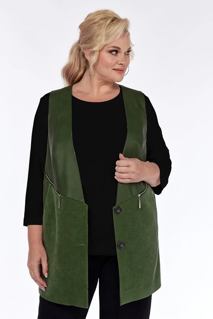 Жилет выполнен путем комбинирования тканей разного вида, вельвета и экокожи. Вырез горловины V — образной формы. Перед с рельефами из плечевого доходящие до подреза на линии талии, в котором обработан декоративный элемент с молнией. В нижней части переда в боковых деталях расположены карманы. Спинка с кокеткой. В боковых швах разрезы.