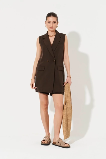 Жилет женский из смесовой ткани. Жилет полуприлегающего силуэта. Жилет двубортный с застежкой на одну обметанную петлю и одну пуговицу. Перед с двумя рельефами, идущими от линии плеча до бокового шва, а также на переде располагается карман с клапаном и двумя обтачками. Спинка со средним швом и с двумя рельефами, идущими от проймы до линии низа изделия. В среднем шве спинки имеется шлица. Горловина V-образная. Жилет на поливискозной подкладке. Данное изделие станет отличным дополнением к любому гардеробу, а большим плюсом является большое содержание льна. Жилет обязательно осчастливит его обладательницу своим прекрасным фасоном. Идеальный вариант как на повседневной основе, так и для деловых встреч.