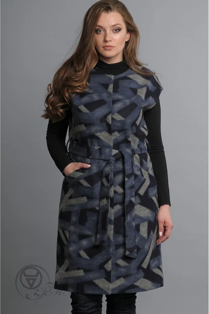 Жилет полуприлегающего силуэта с круглым вырезом горловины и спущенным плечевым швом. Перед с центральной, бортовой, потайной застежкой на пришивные кнопки. На переде прорезные карманы, вход в которые обработан листочками. На боковых швах шлевки с протянутым поясом. Спинка со средним швом. Жилет чуть расклешен к низу. Размеры 42-46 : Длина изделия - 90 см.Размеры 48-52 : Длина изделия - 100 см.