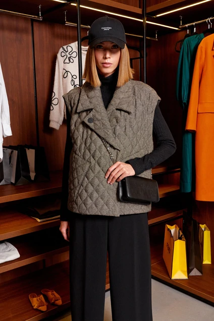 Когда на улице появляется первый холодный ветерок, советуем присмотреться к такой классной и стильной верхней одежде, как утеплённые жилеты. Жилет выполнен из стеганного шерстяного текстиля на синтепоне. Воротник-стойка, застёжка глубокая до верха на потайные кнопки, по бокам накладные карманы. Уютная и теплая, самая актуальная вещь для осени.