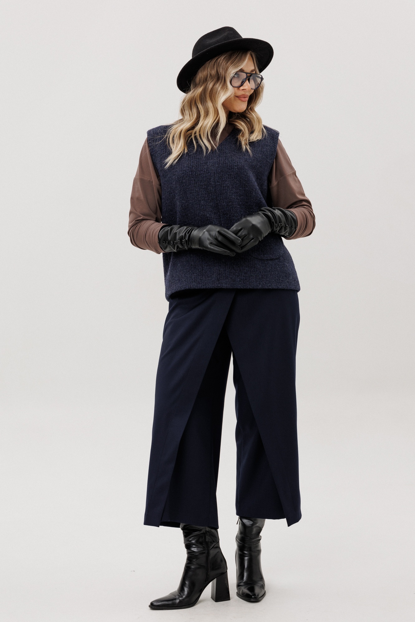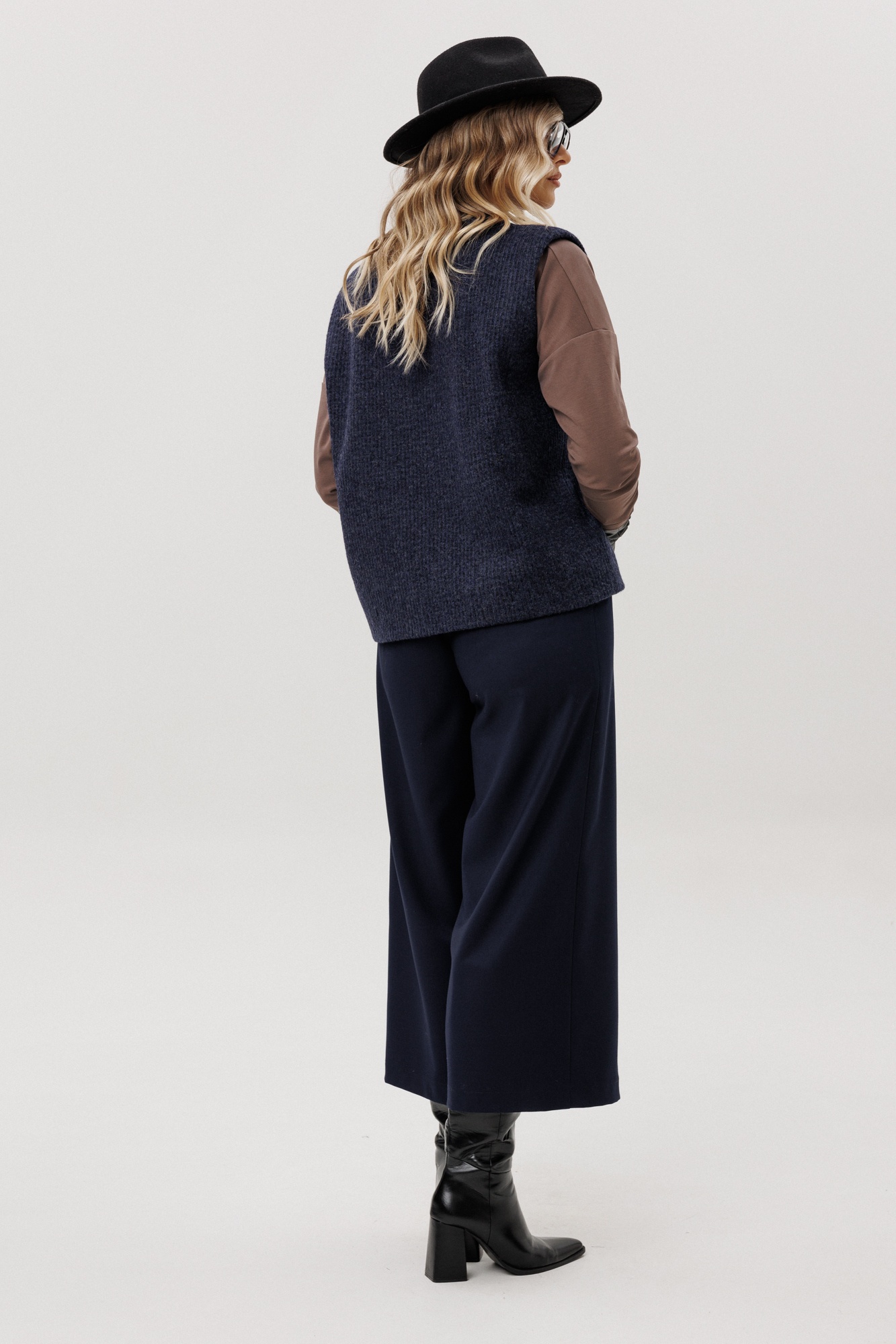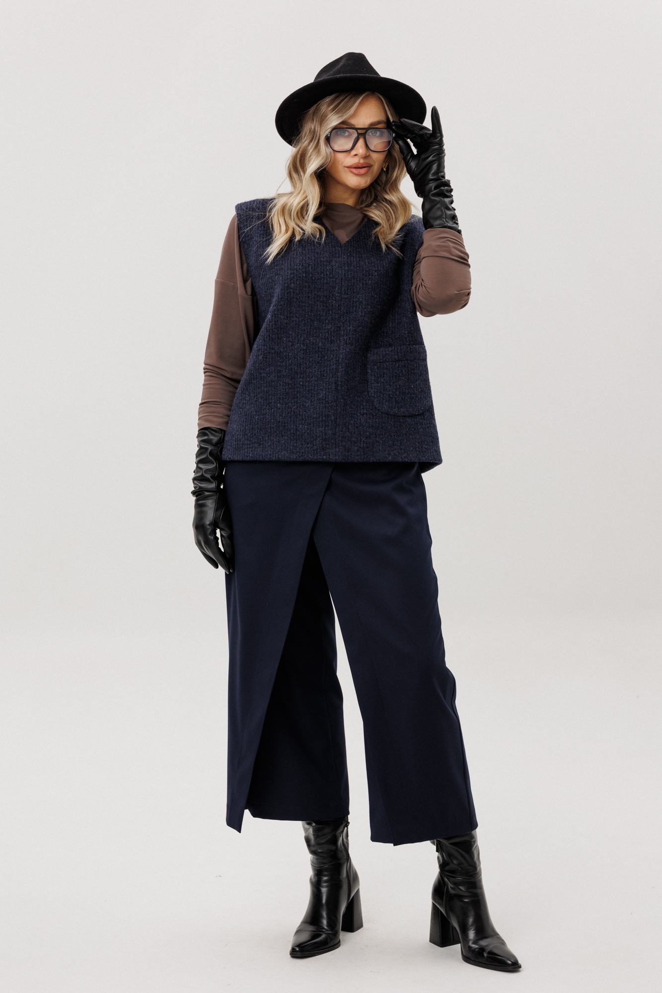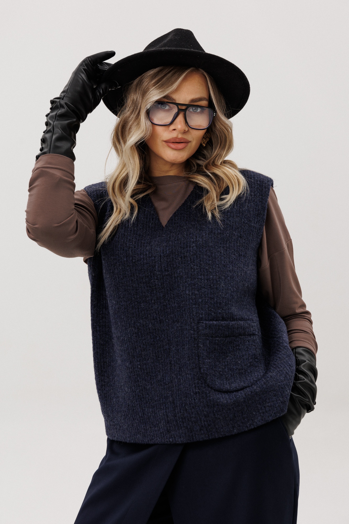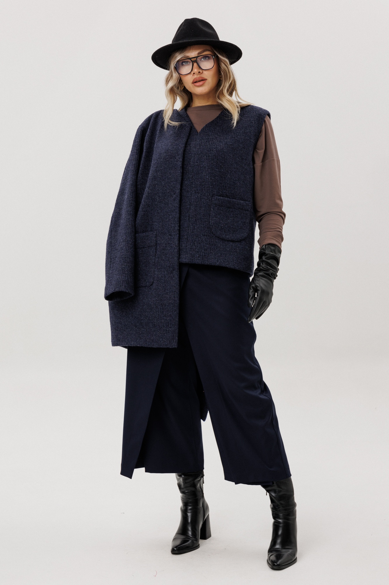 Элегантный тёмно-синий жилет, выполненный из качественного полушерстяного вязаного полотна, гармонично сочетается с мягкой трикотажной подкладкой. Эта модель без застежки идеально подходит для создания современных слоёв в образе. Традиционный крой с широкими проймами обеспечивает комфорт и удобство, делая акцент на расслабленный, но в то же время стильный силуэт. Жилет добавит изысканности любому ансамблю, будь то деловой или повседневный лук.