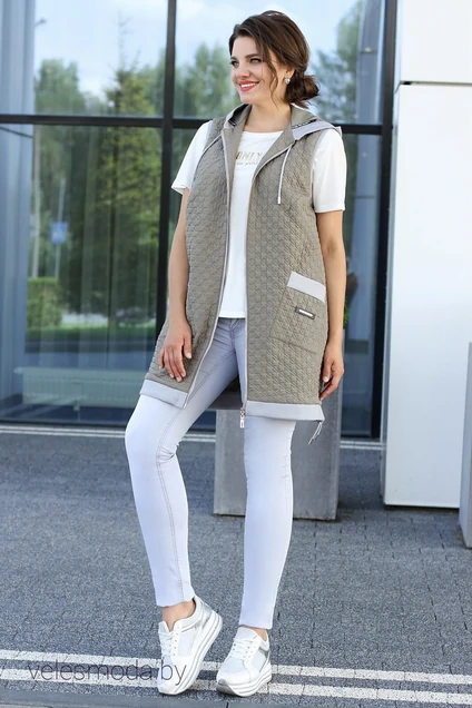 Жилет женский прямого силуэта с застежкой встык на тесьму-молнию с капюшоном. Перед с нагрудными вытачками и косыми накладными карманами. По капюшону, по низу изделия и по верху кармана отрезные планки, выполненные из отделочного материала. Проймы обработаны отделочным кантом. В боковых швах - разрезы. По капюшону и по низу жилета декоративный шнур. Жилет с множеством декоративных элементов в спортивном стиле выполнен из стеганого материала и пригодится всем без исключения женщинам, которые захотят прогуляться в прохладную погоду. Жилет на подкладке. длина спинки : 88 см