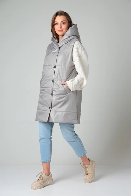 Жилет женский выполнен из плащевой ткани, простеганной с синтепоном (200гр/м2). Жилет двубортный с капюшоном. Застежка спереди на пробивные кнопки. Спереди на полочке прорезной карман с листочкой. Спинка цельная. Рассчитано на температурный режим до -10 “теплая зима” (указанная температура комфорта может зависеть от индивидуальной восприимчивости к холоду).