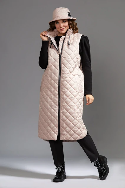 Жилет женский из стеганной ткани (не тянется) на подкладке прямого силуэта, удлиненный. Застежка центральная на молнию. Вырез горловины – воротник «стойка», на полочках обработаны прорезные карманы с клапаном. На спинке настрочена декоративная нашивка и вставлена молния (расстегивается как разрез). Длина жилета – 118 см.