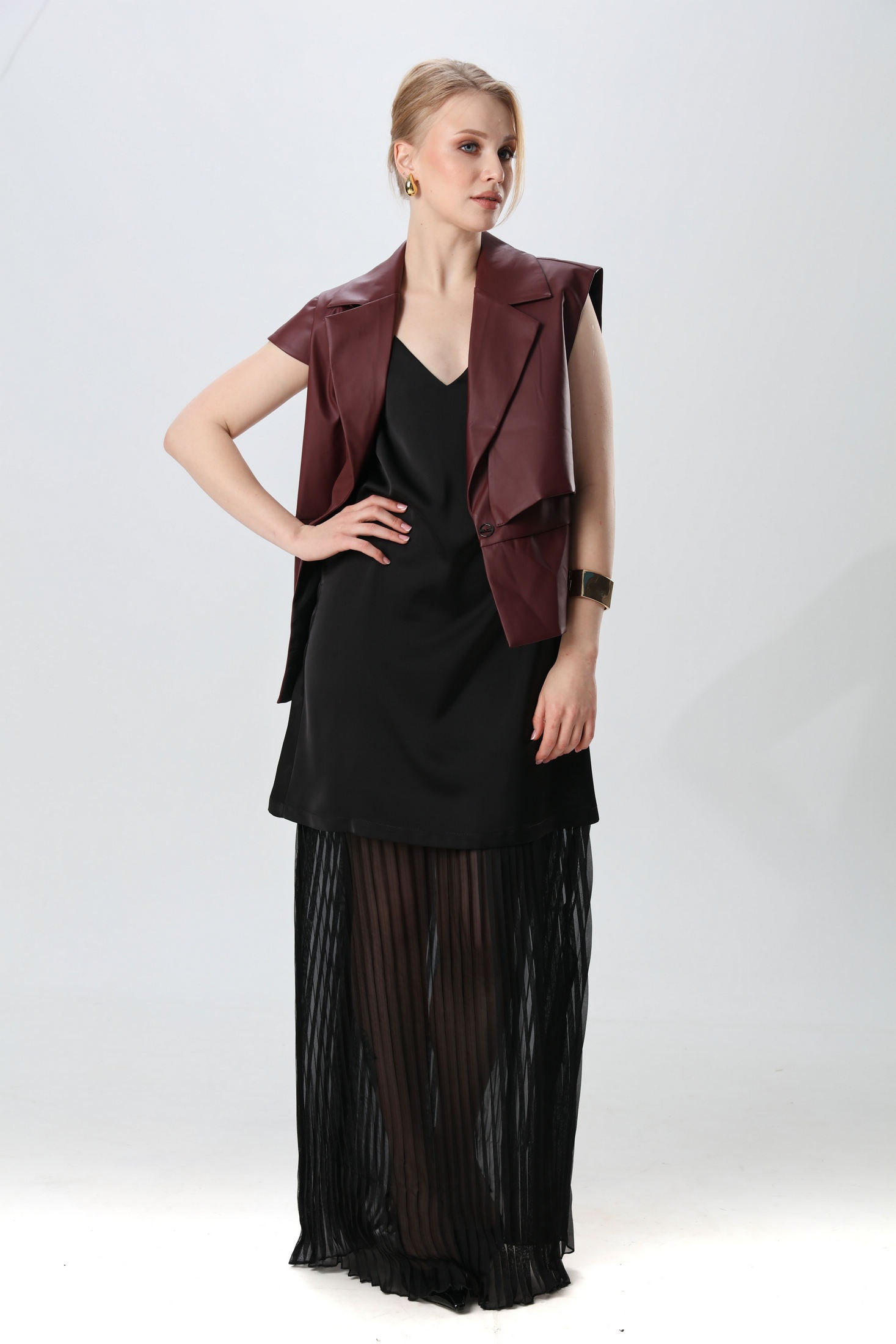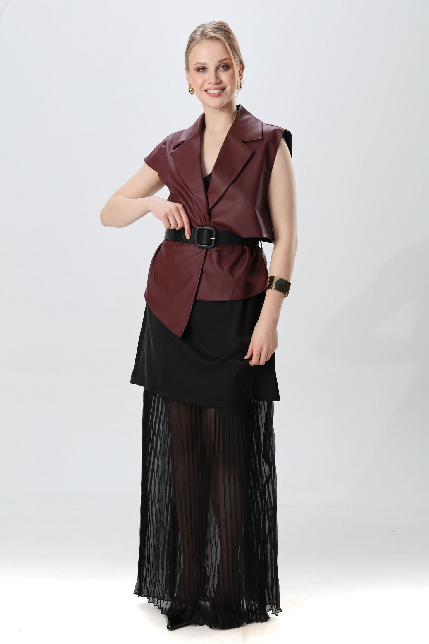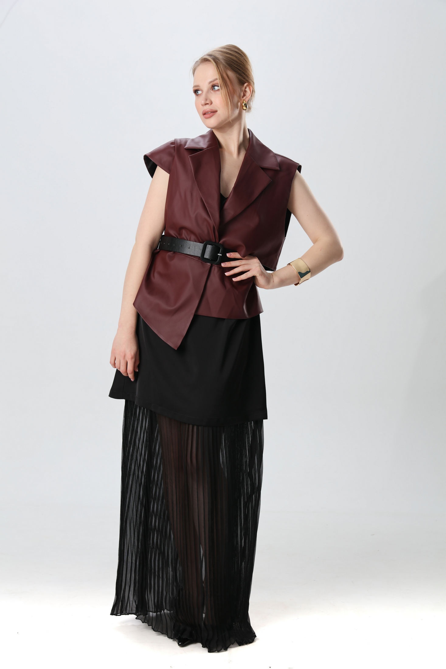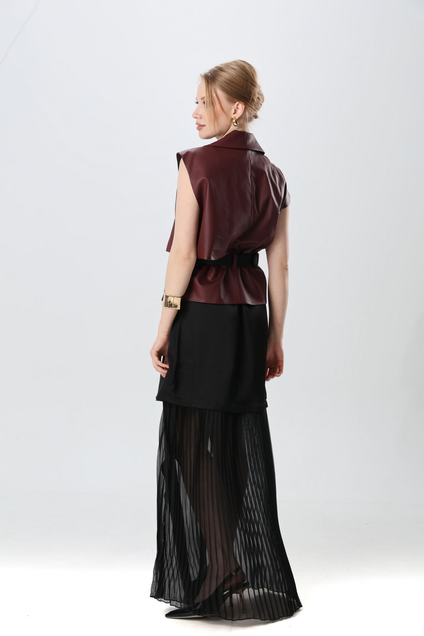 Жилет из экокожи прямого силуэта с воротником пиджачного типа. По правой пройме переда расположена фигурная деталь "крылышко". Спинка со средним швом. По низу правого переда и низу правой спинки фигурная деталь. По левой части переда и левой части спинки отлетная кокетка. Изделие идёт в комплекте с ремнем из экокожи.