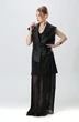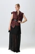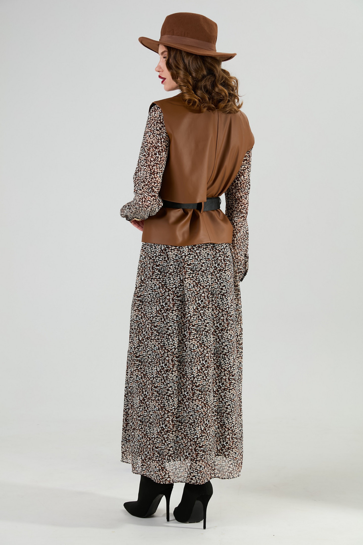 Жилет из экокожи прямого силуэта с воротником пиджачного типа. По правой пройме переда расположена фигурная деталь "крылышко". Спинка со средним швом. По низу правого переда и низу правой спинки фигурная деталь. По левой части переда и левой части спинки отлетная кокетка. Изделие идёт в комплекте с ремнем из экокожи.