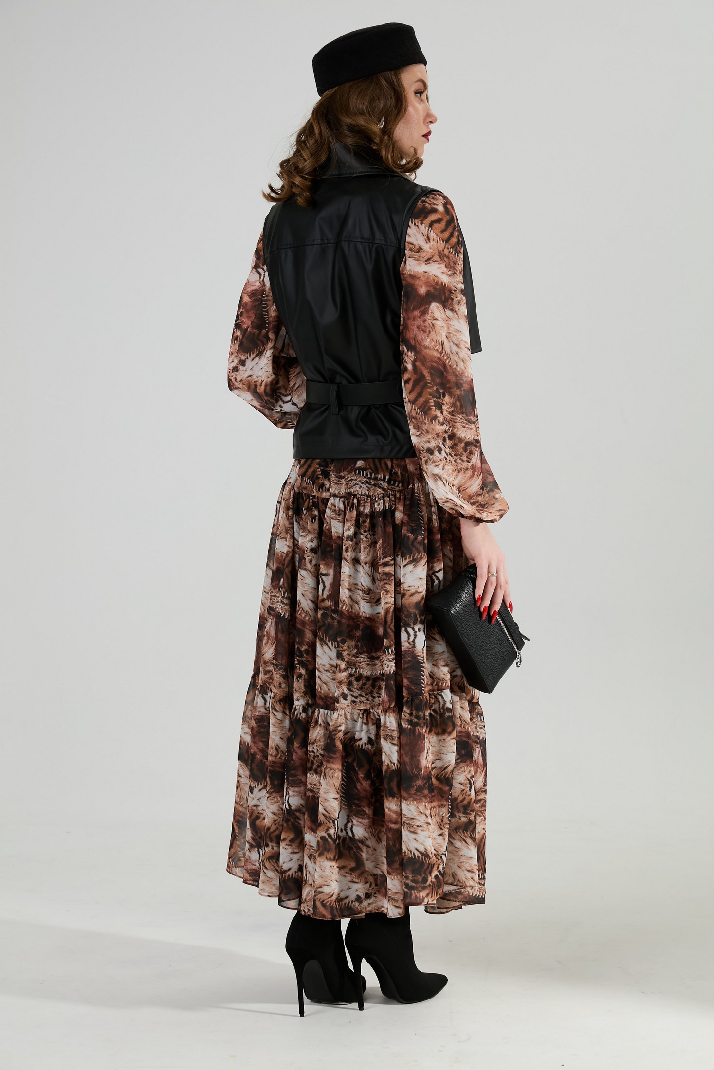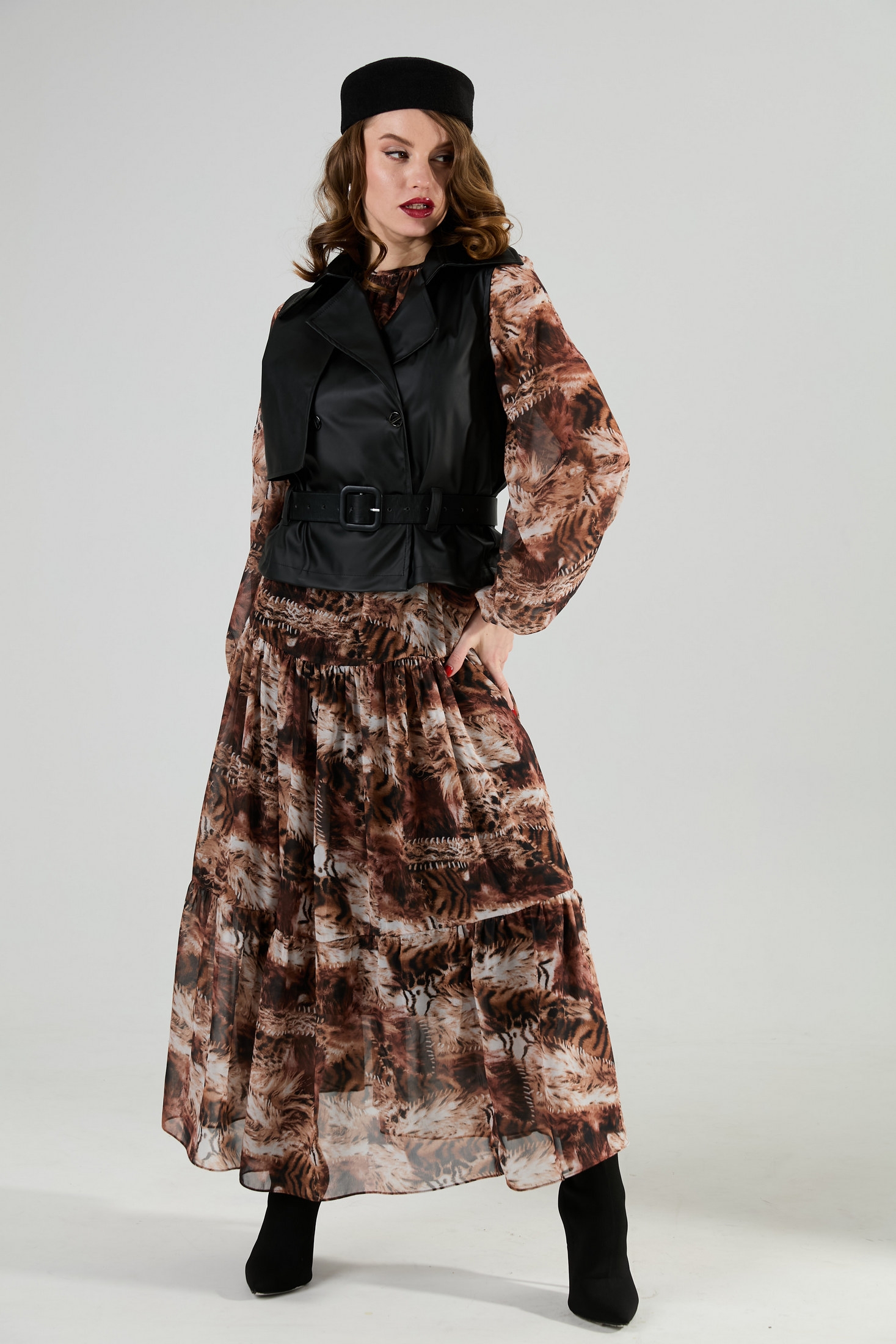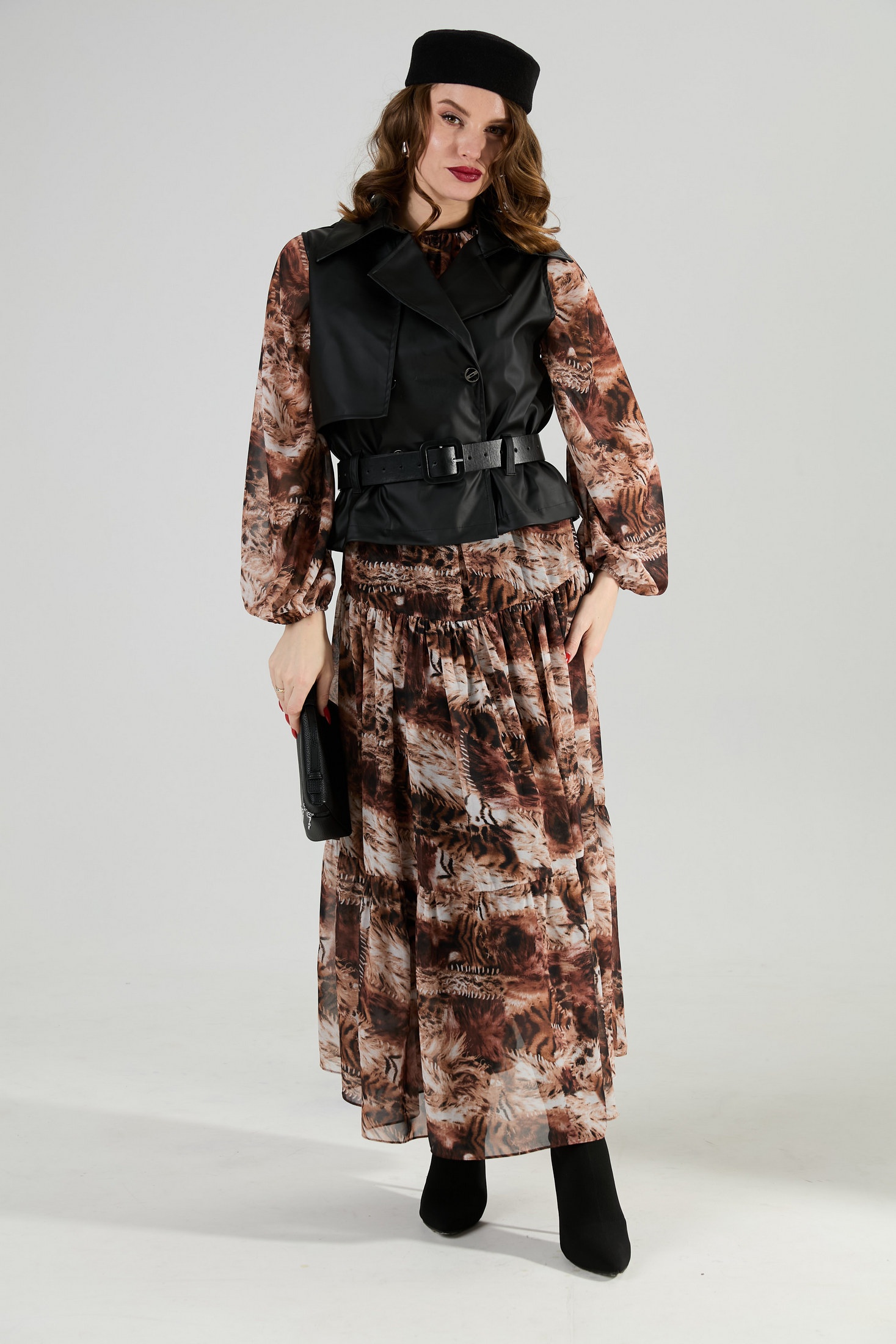 Элегантный двубортный жилет черного цвета оформлен отложным воротником на отрезной стойке, добавляя классическую ноту к вашему образу. Дизайн жилета прямого силуэта умеренного объема создает строгую и респектабельную линию. Застежка на петли и пуговицы придает изделию функциональность, а талия подчеркивается съемным ремнем из экокожи, проходящим через шлевки на боковых швах. Ремень входит в комплект, и это позволяет акцентировать фигуру, делая акцент на талии.