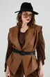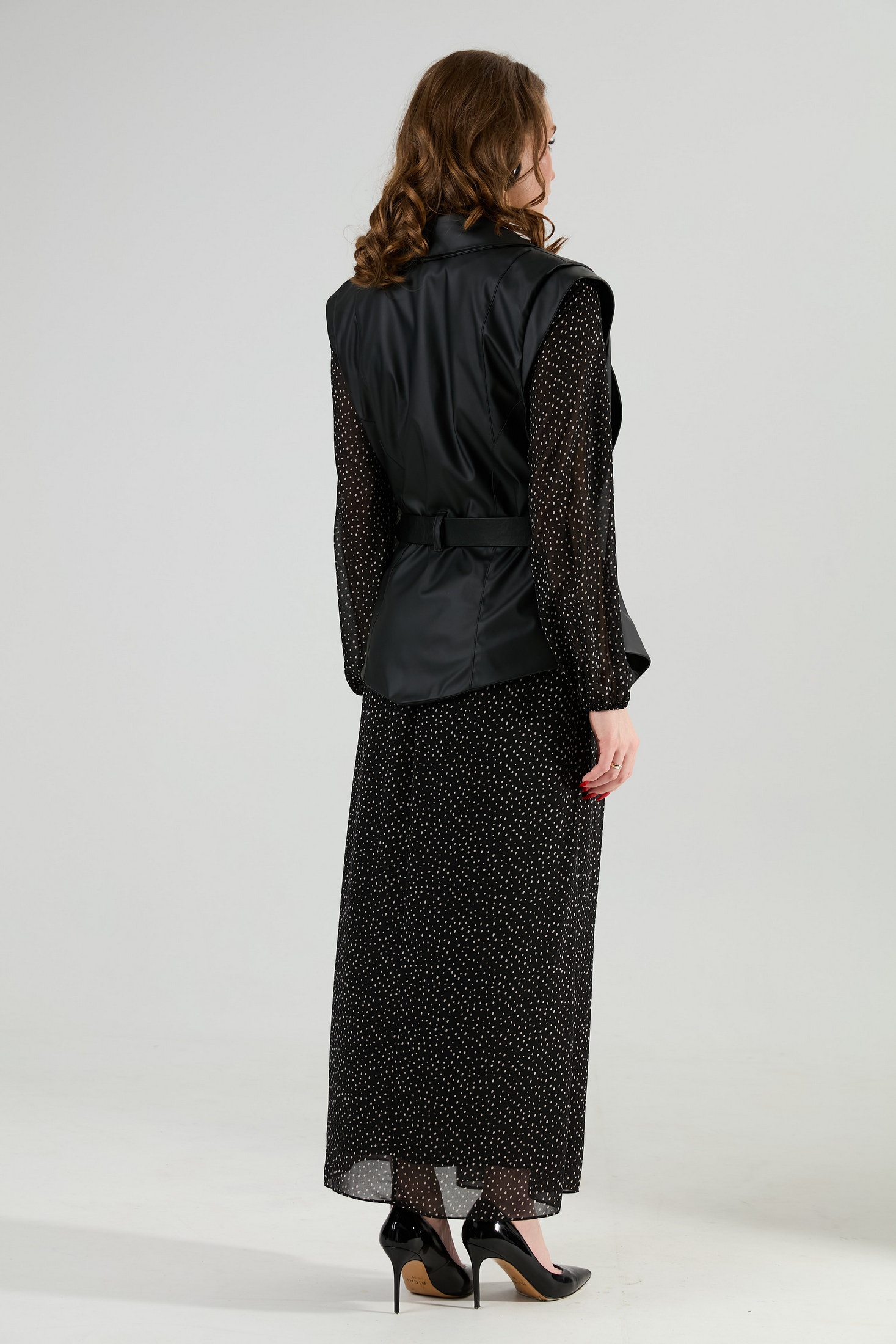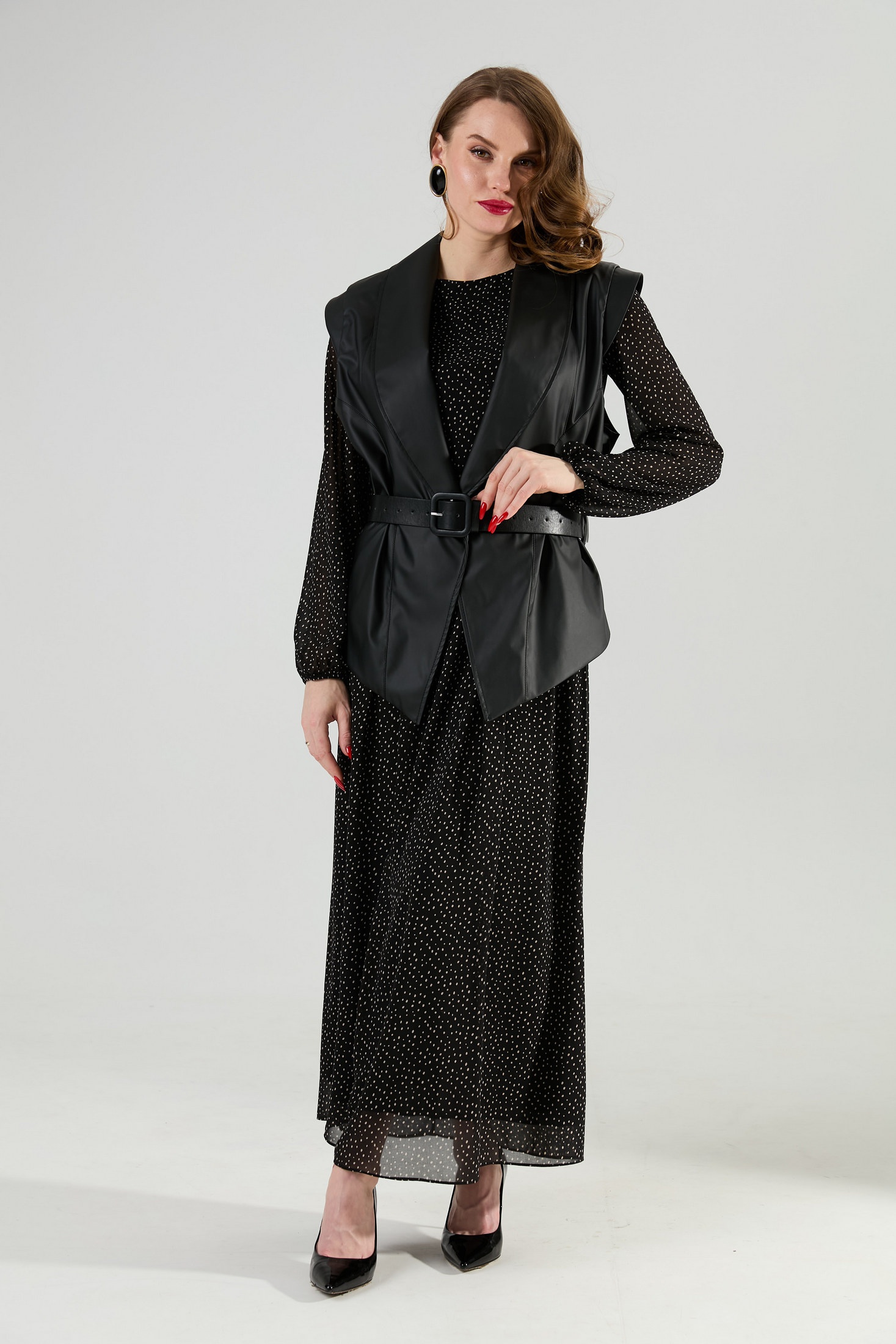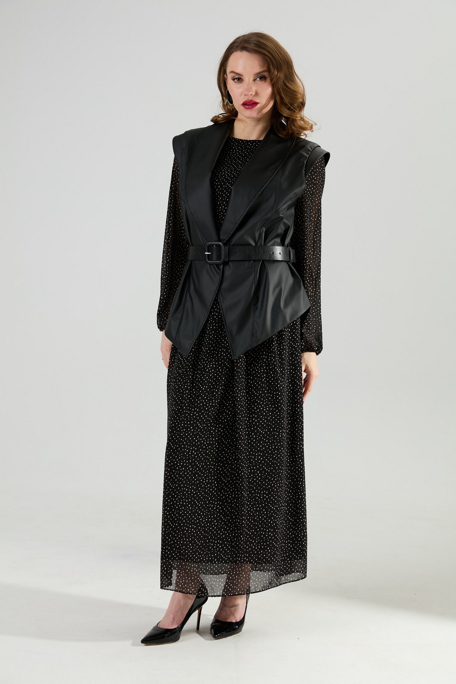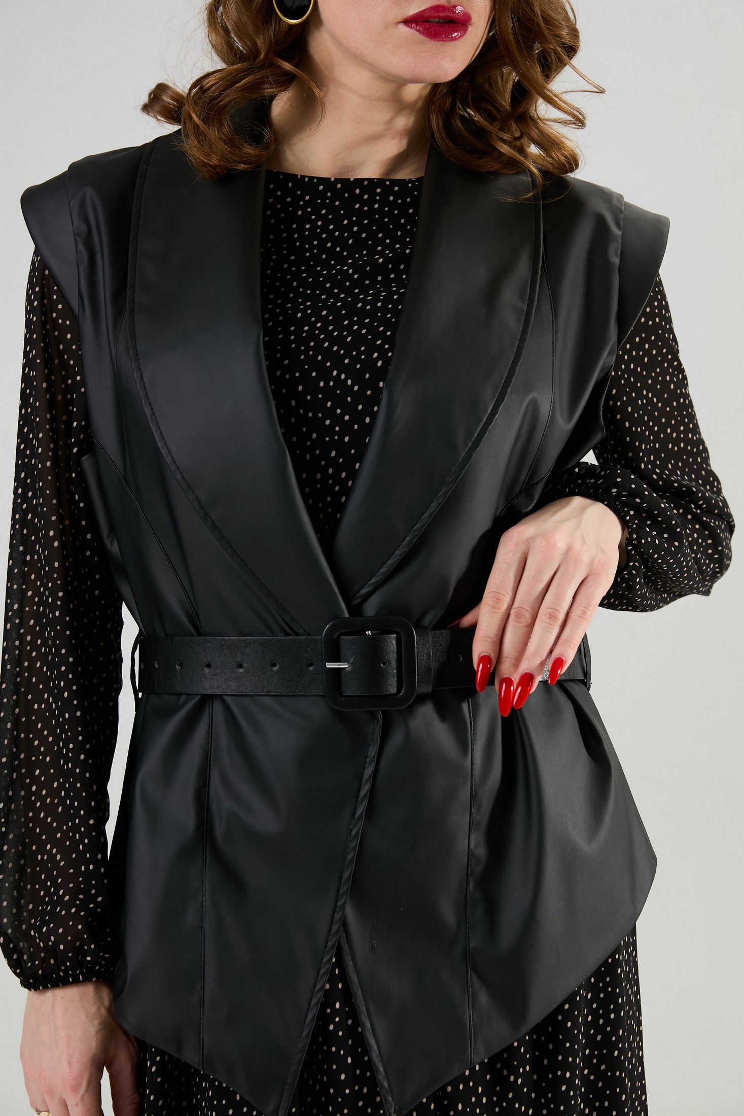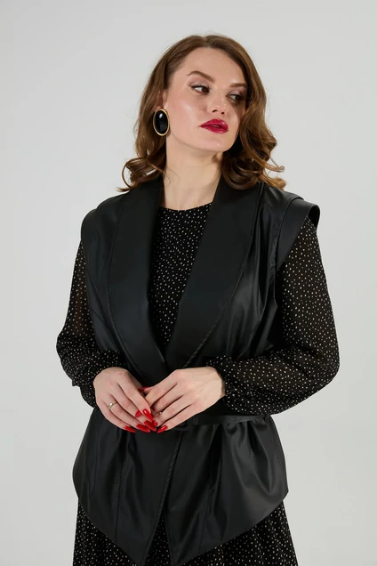 Элегантный жилет выполнен в тёмных тонах, преимущественно в черном цвете, идеально подходит как элемент делового или повседневного гардероба. Особенностью дизайна является удлиненный свободный прямой силуэт и воротник пиджачного типа, дополняющий стильное направление изделия. Жилет обладает привлекательной фигурной ассиметричной линией низа как по переду, так и по спинке. Короткие рукава-крылышки добавляют изящества, а талия акцентируется съемным ремнем из экокожи, который проходит через стильные шлевки в боковых швах. Этот модный акцент не только подчеркивает силуэт, но и придает изделию завершенный вид. Ремень, включенный в комплект, усиливает универсальность модели, позволяя адаптировать под различные фасоны и предпочтения.