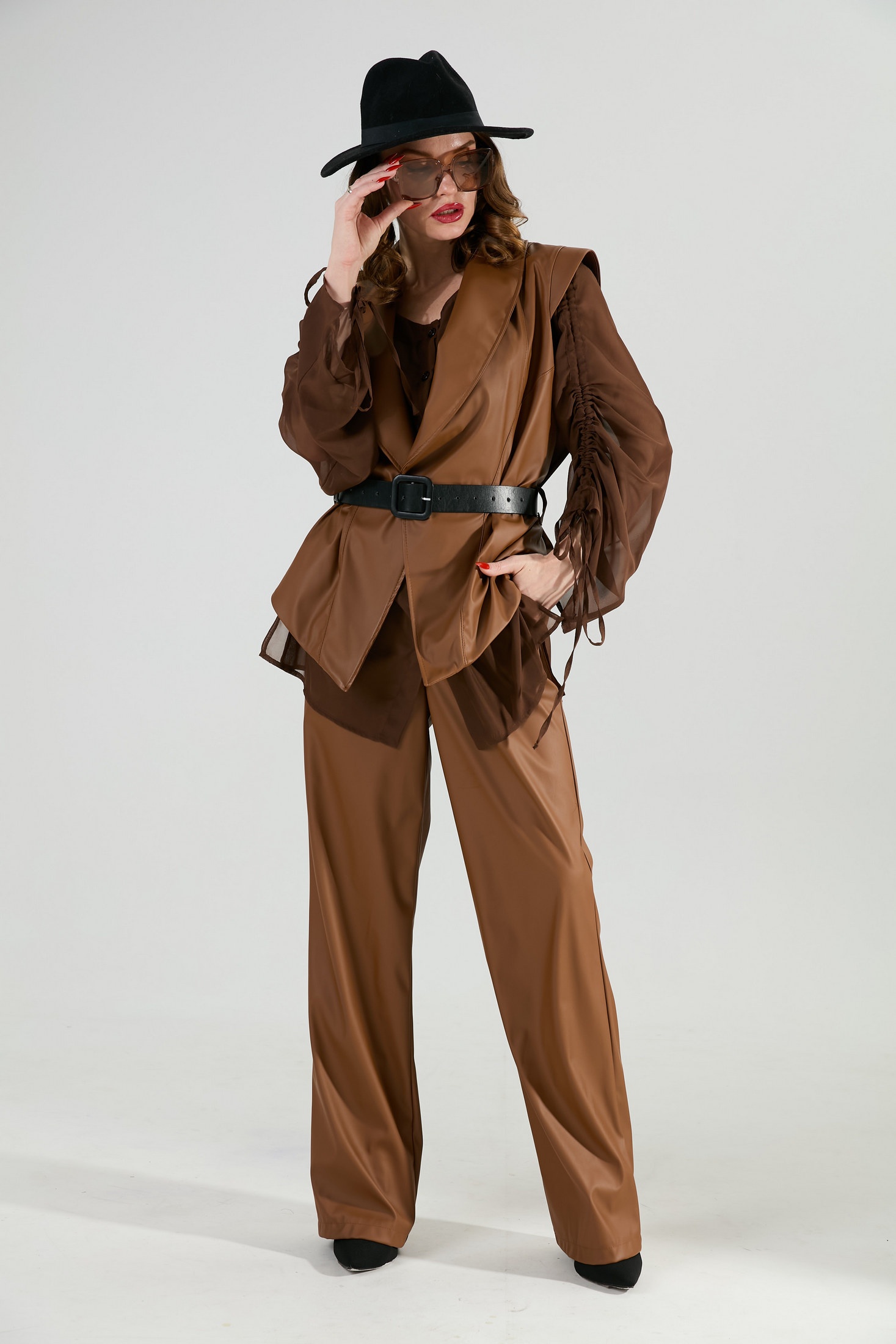 Жилет удлиненный свободного прямого силуэта, воротник пиджачного типа. Линия низа по переду и спинке фигурная ассиметричная. Короткий рукав-крылышко. Талия фиксируется съемным ремнем из экокожи, для которого в боковых швах оформлены шлевки. Ремень идёт в комплекте к изделию.