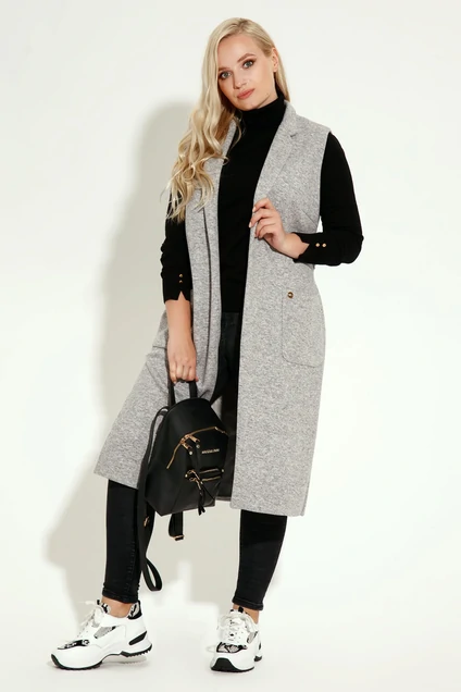 Стильный удлиненный жилет из полушерстяной ткани. Жилет без застежки на запах со съёмным поясом из основной ткани. Жилет длиной ниже коленей, по бокам разрезы, по переду большие накладные карманы. Жилет имеет V-образный вырез горловины с воротником и лацканами. Стильный модный жилет отлично сочетается как с классическими брюками, создавая строгий офисный стиль, так и отлично сочетается с любимыми джинсами и кроссовками в стиле кэжуал.