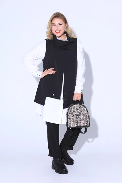 Комплект-двойка из жилета и рубашки. Жилет полуприлегающего силуэта из костюмной ткани. Перед асимметрично разделен вертикальными швами с разрезами разной высоты. Широкий округлый вырез горловины обработан мягкой стойкой. Низ декорирован люверсами разной ширины. Спинка со средним швом. Изделие на подкладке. Рубашка из хлопковой ткани прямого силуэта длиной "миди". Центральная застежка на пуговицы, рубашечный воротник, втачной рукав на манжете. Низ с фигурным краем. По спинке обработана двойная кокетка