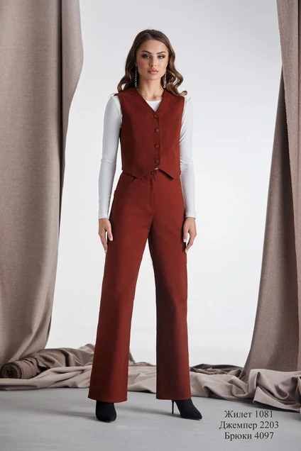 Укороченный жилет приталенного силуэта с центральной однобортной застежкой на петли и пуговицы. Перед с рельефными швами и фигурным низом, спинка с отрезными бочками. Использование большого количества отделочных строчек добавляют особую выразительность изделию.
