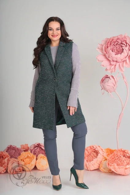 Изделие: Жилет женский Наименование основного материала: - жилет: ткань текстильная:65% вискоза, 30% полиэстер, 5%эластан Наименование материала подкладки: подкладка (полиэстер 100%) Описание внешнего вида жилета: Жилет женский из текстильной ткани «шанель». Жилет прямого силуэта, длиной размер 46-89,0см; размер 52-91см. Перед с нагрудными вытачками и двумя прорезными карманами с листочками. Спинка со средним швом, плечевыми вытачками. Проймы обработаны обтачками. Жилет с центральной бортовой застежкой на одну петлю и одну пуговицу, с отложными лацканами. Горловина обработана отложным воротником на стойке. Жилет обработан притачной по низу подкладкой