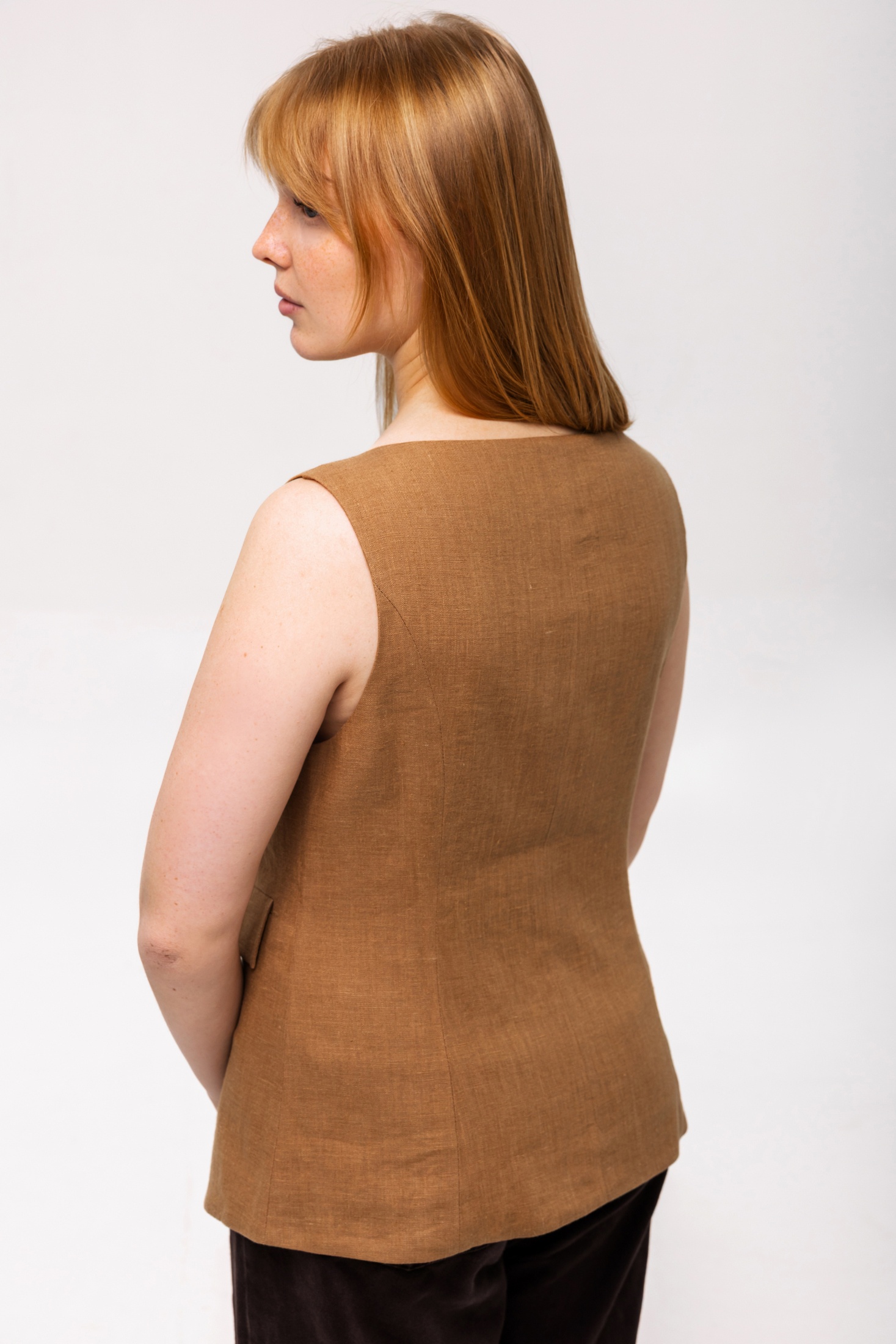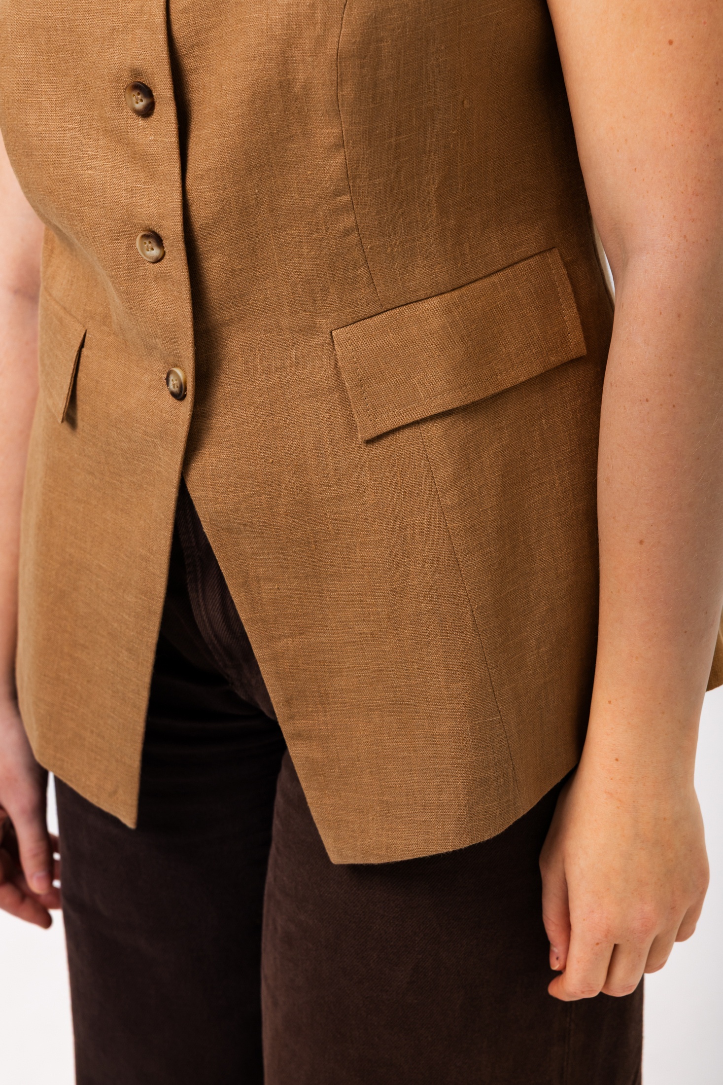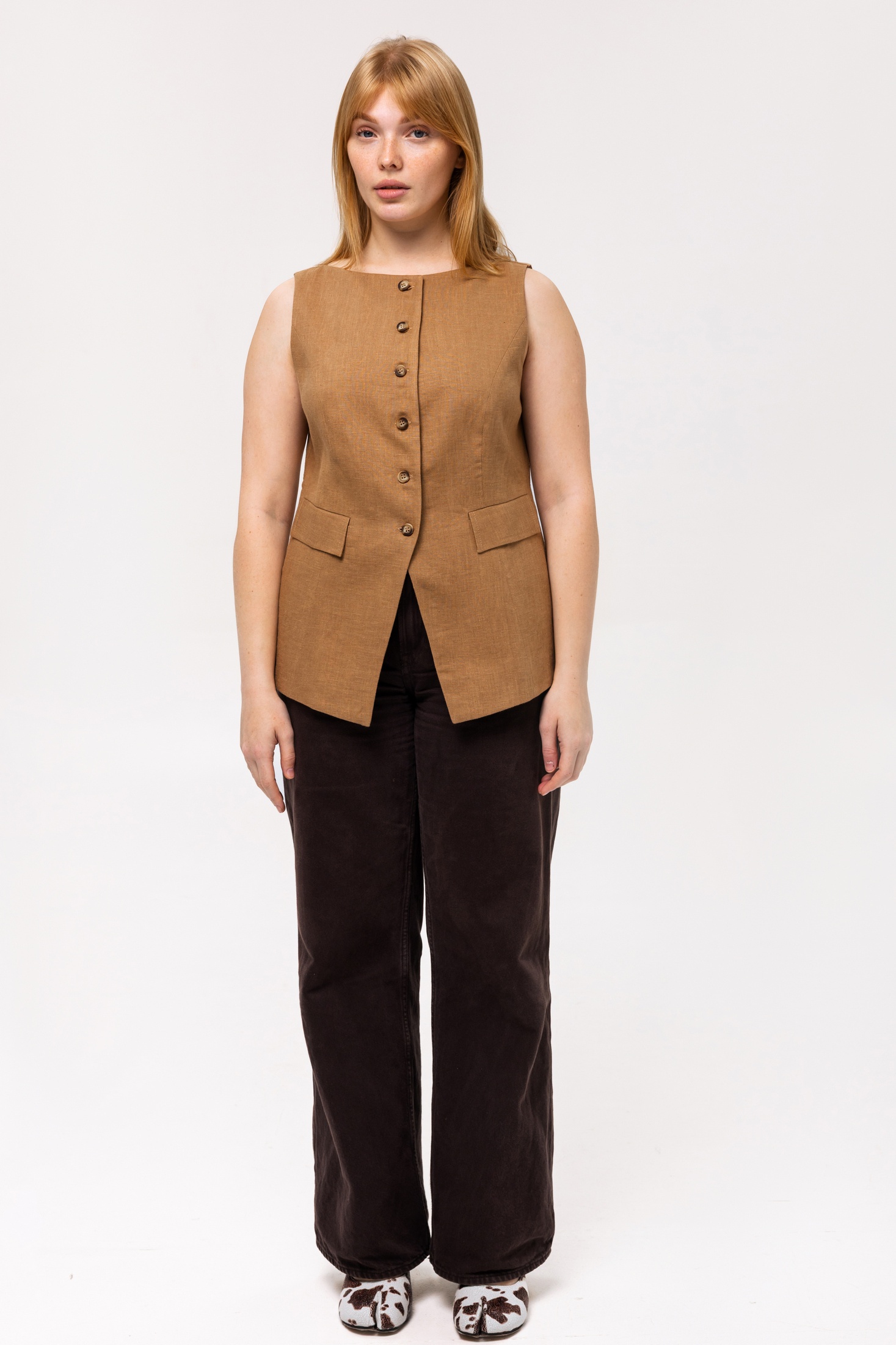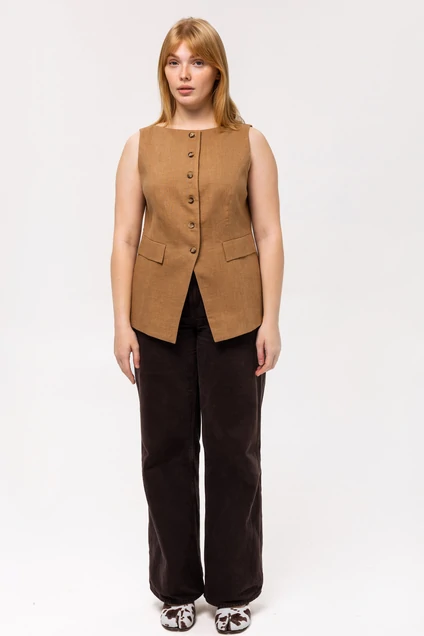 Элегантный женский жилет в теплом коричневом цвете добавит стильный акцент в ваш гардероб. Приталенная модель на пуговицах подчеркнет фигуру, а классический дизайн с V-образным вырезом позволит сочетать эту вещь как с офисными рубашками, так и с повседневными топами. Два накладных кармана на передней части не только удобны, но и добавляют детали в общую структуру жилета. Использование качественного материала гарантирует долговечность и комфорт при носке. Этот жилет станет идеальным дополнением к изысканному образу.