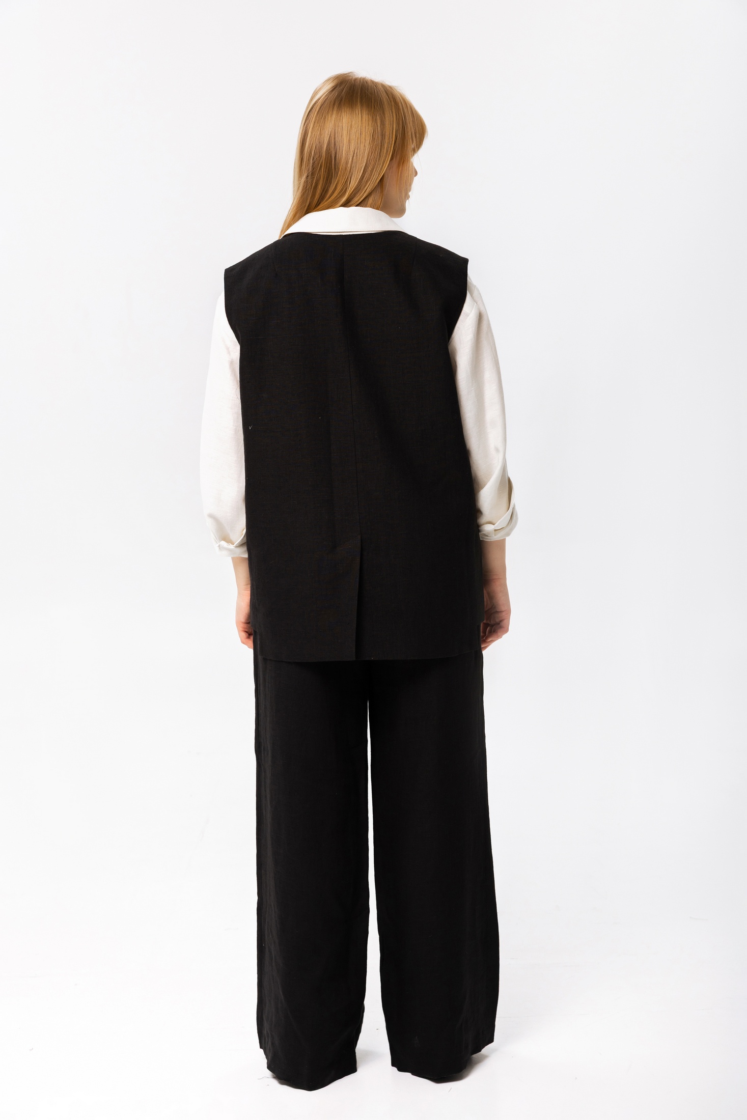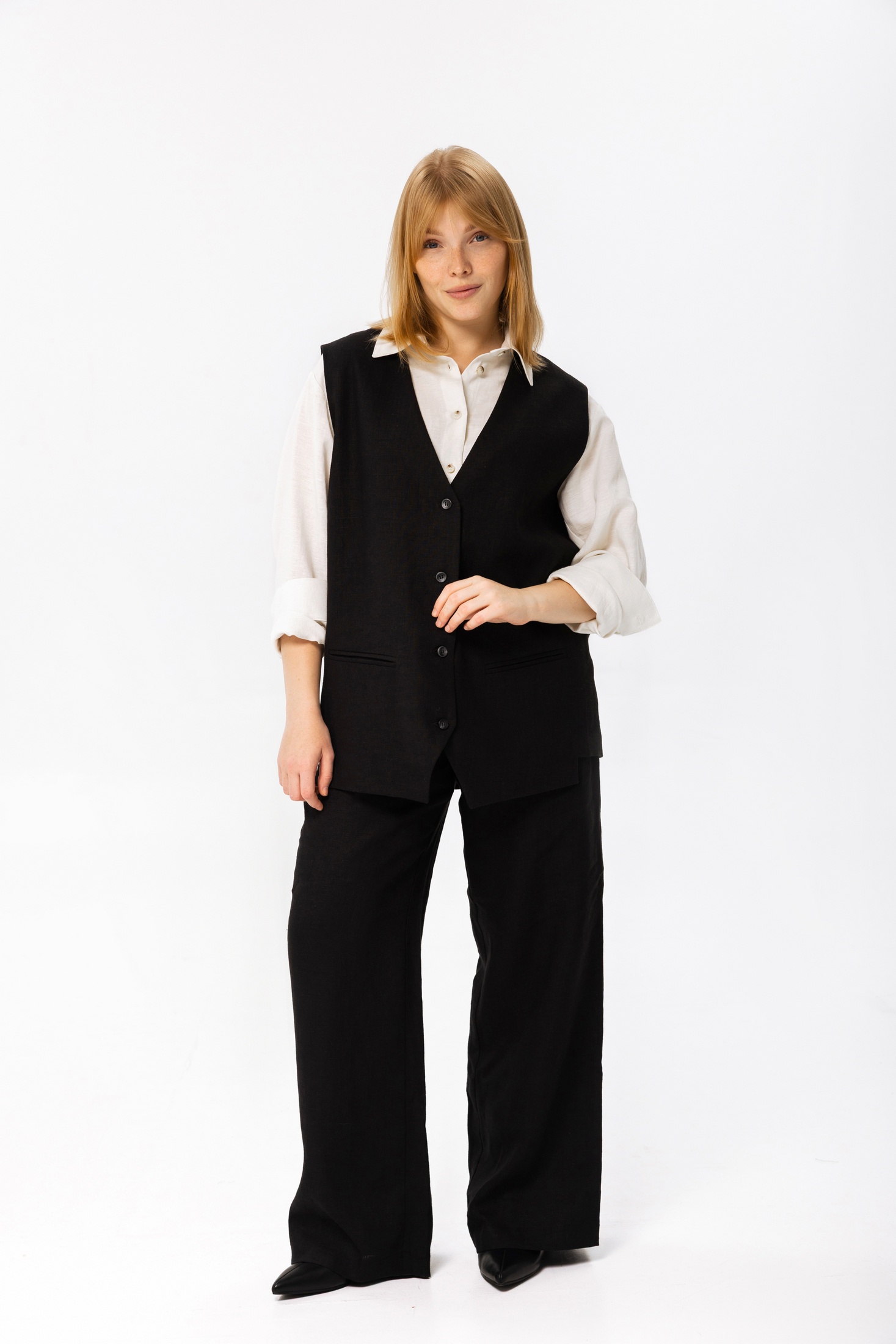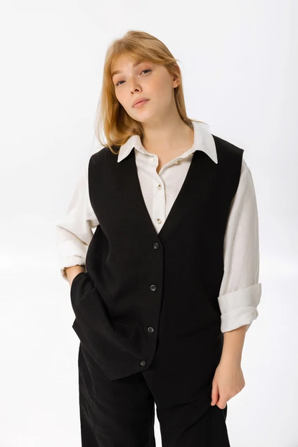 Элегантный женский жилет прямого кроя в классическом стиле. Изделие выполнено в универсальном черном цвете без принтов, что делает его идеальным дополнением к любому гардеробу. Жилет оснащен удобной пуговичной застежкой спереди и изготовлен из качественной ткани, обеспечивающей комфорт и долговечность. Широкий воротник добавляет изделию изысканности, делая его отличным выбором для деловых и повседневных образов.