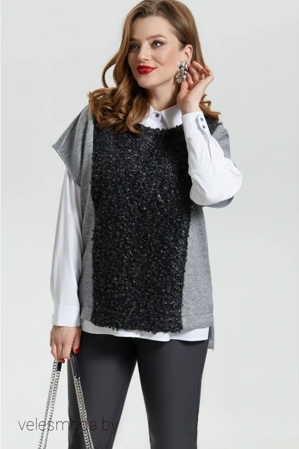 Комплект женский двухпредметный из мягкого теплого жилета и рубашки. Жилет прямого силуэта со спущенным плечом. По переду и спинке вертикальные вставки из меха. По боковым швам внизу невысокие разрезы. Спинка немного длиннее переда. Вырез горловины круглый. Рубашка прямого силуэта с втачным рукавом. На спинке прямая кокетка со складкой посредине. Рукав прямой, низ рукава на манжете. Застежка центральная потайная. Воротник на стойке. По боковым швам внизу разрезы.