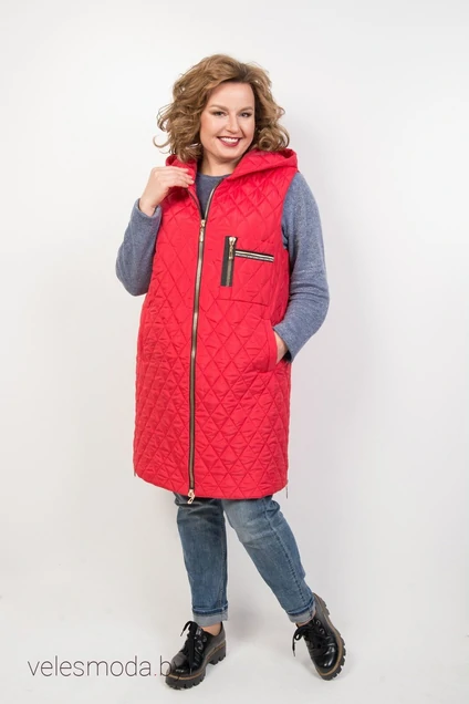 Жилет утепленный, "А"-образного силуэта с капюшоном. Застежка на декоративной молнии, карманы с листочкой. В боковых швах функциональная молния, низ фигурный.