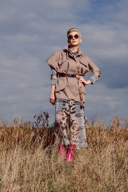 Жилет свободного силуэта со спущенным плечом.  Выполнен из плотного хлопкового полотна, на подкладке. Спереди застёжка на тесьму-молнию, по верхней части накладные карманы с клапанами, по нижней части прорезные карманы с клапанами. Воротник отложной на стойке. В комплекте пояс. Длина 74 см.