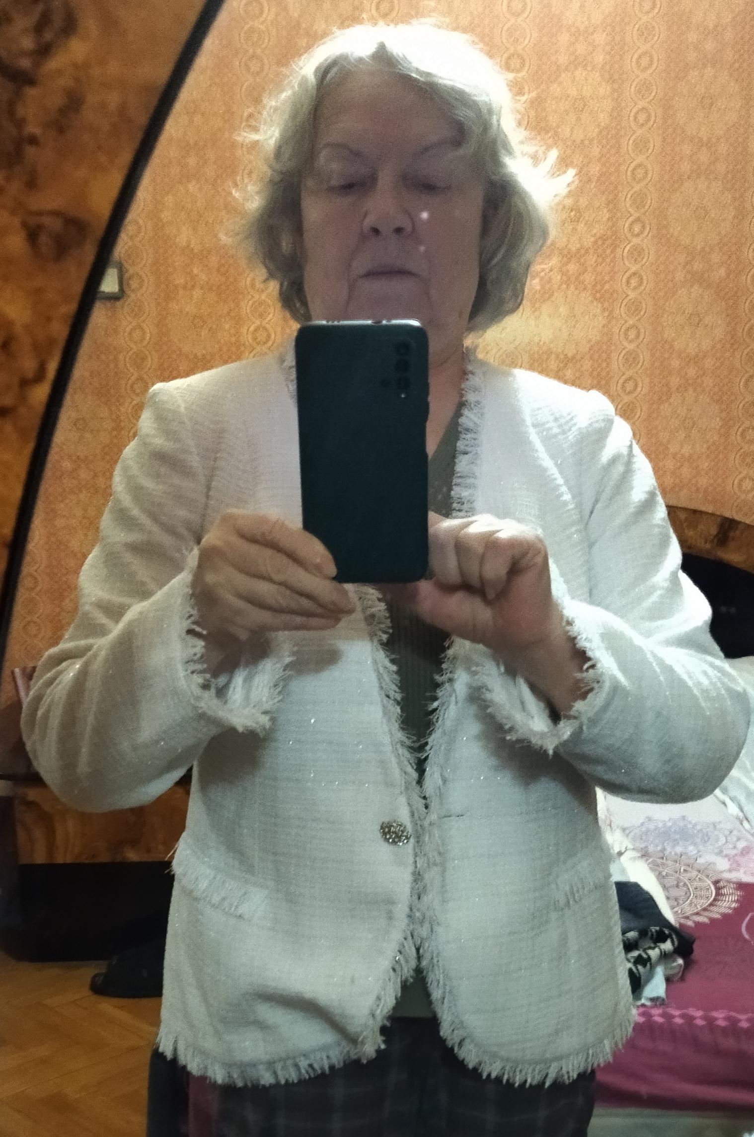 Немного неудачно посажен на подкладку. Подтягивает полы. И это еще до чистки/стирки. Нахожусь в сомнении. Ткань, стиль, фасон нравится. Но вот это поддергивание полы жакета сильно удешевляет вид....